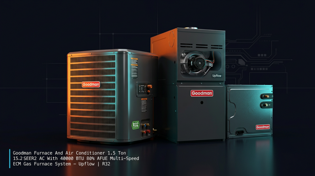The Goodman 1.5 Ton 15.2 SEER2 AC with 40000 BTU 80% AFUE Gas Furnace is a complete heating and cooling system designed for upflow installations using R32 refrigerant. This unit combines a high-efficiency scroll compressor condenser with a multi-speed ECM furnace blower for balanced performance and energy savings. It’s built for homeowners seeking reliable comfort with AHRI certification and a 10-year parts warranty.