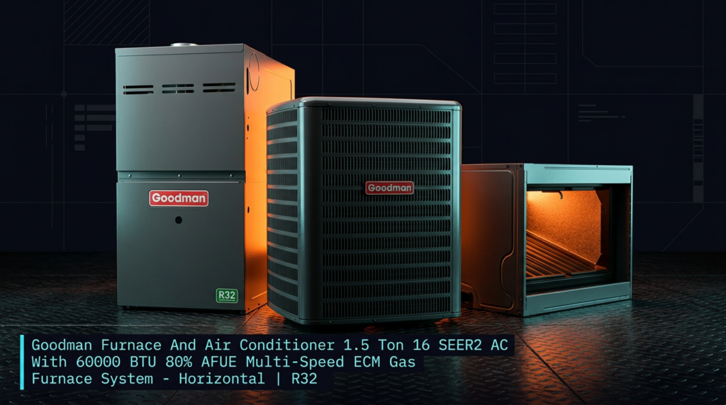 The Goodman 1.5 Ton 16 SEER2 AC with 60000 BTU 80% AFUE Gas Furnace is a complete heating and cooling system built for horizontal installation with R32 refrigerant. This unit combines a high-efficiency scroll compressor condenser with a multi-speed ECM furnace to deliver reliable performance for residential applications. The system is AHRI certified and factory-charged for 15 feet of tubing, ready for straightforward installation.