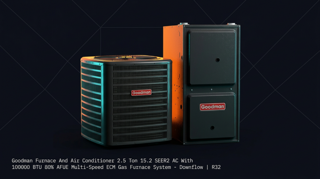 The Goodman 2.5 Ton 15.2 SEER2 AC with 100,000 BTU 80% AFUE Gas Furnace System delivers efficient heating and cooling for residential applications. This downflow configuration pairs a high-efficiency scroll compressor air conditioner with a multi-speed ECM gas furnace, making it suitable for homeowners seeking reliable performance and lower operating costs.