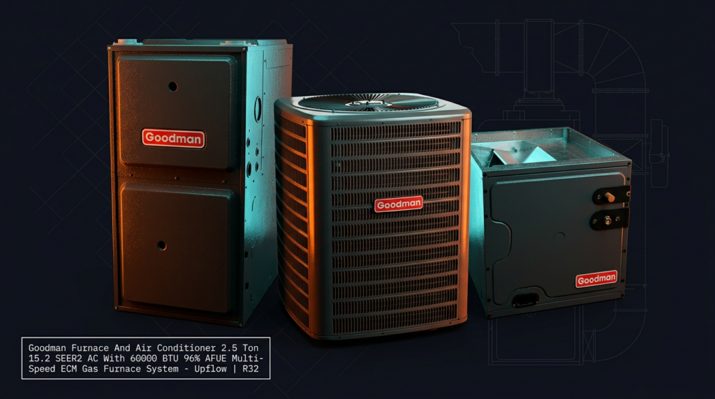 The Goodman 2.5 Ton 15.2 SEER2 system combines a high-efficiency air conditioner with a 96% AFUE gas furnace for year-round climate control. This R32 refrigerant unit delivers 60,000 BTU heating output and is designed for upflow installation in residential applications. It’s built for homeowners and contractors seeking reliable performance with strong energy efficiency ratings.