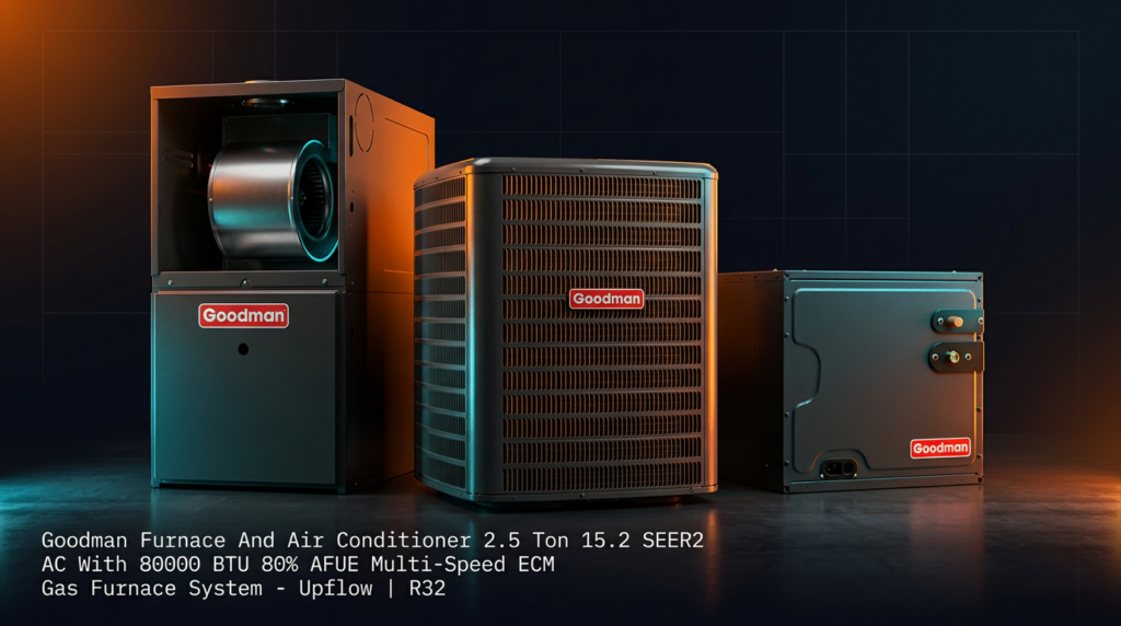 Goodman Furnace And Air Conditioner 2.5 Ton 15.2 SEER2 AC With 80000 BTU 80% AFUE Multi-Speed ECM Gas Furnace System – Upflow | R32