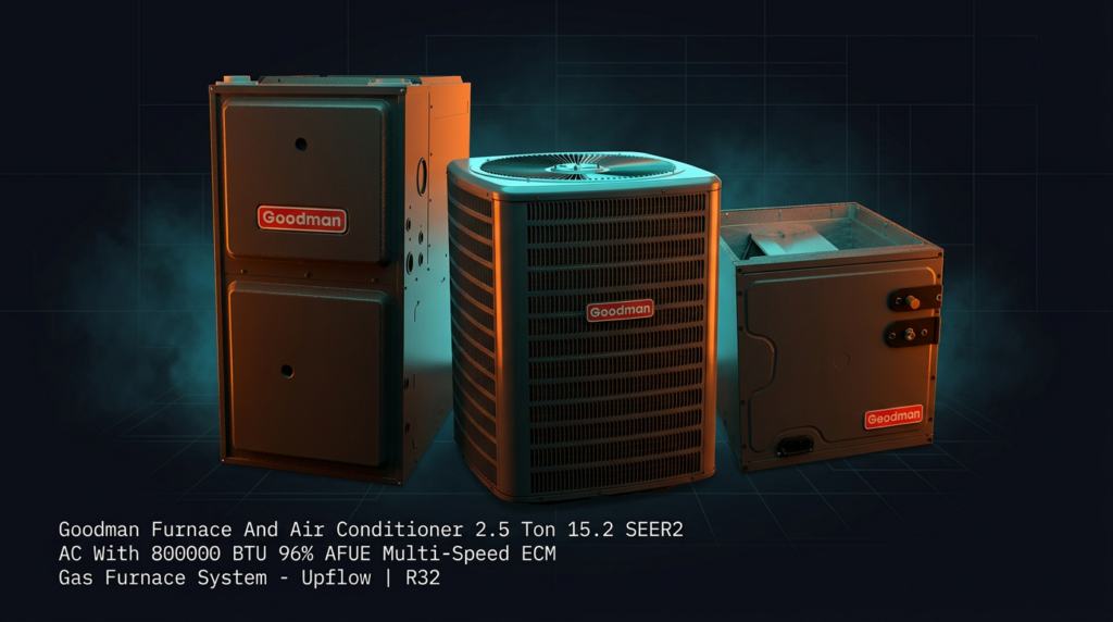 The Goodman 2.5 Ton 15.2 SEER2 system pairs a high-efficiency R32 air conditioner with an 80,000 BTU 96% AFUE gas furnace for year-round climate control. This upflow configuration is designed for homes requiring reliable cooling and heating in a single integrated system. The R32 refrigerant and advanced compressor technology deliver efficient operation while the multi-speed ECM furnace blower adapts to heating demands.