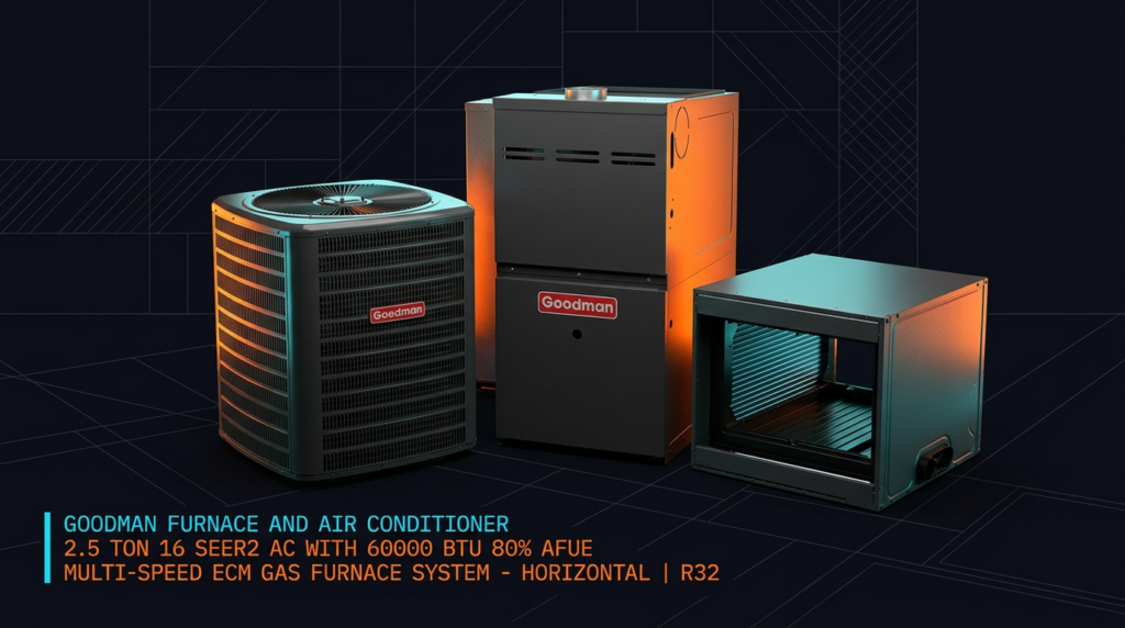 Goodman Furnace And Air Conditioner 2.5 Ton 16 SEER2 AC With 60000 BTU 80% AFUE Multi-Speed ECM Gas Furnace System – Horizontal | R32