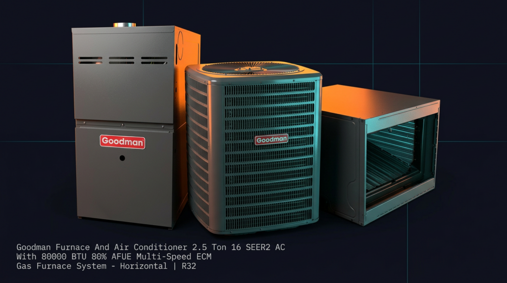 The Goodman 2.5 Ton 16 SEER2 AC with 80% AFUE Gas Furnace System delivers efficient heating and cooling in a horizontal configuration using R32 refrigerant. This matched pair combines a high-efficiency scroll compressor condenser with a multi-speed ECM furnace, making it suitable for homeowners seeking reliable performance and lower operating costs. The system is AHRI certified and ETL listed for dependable operation.
