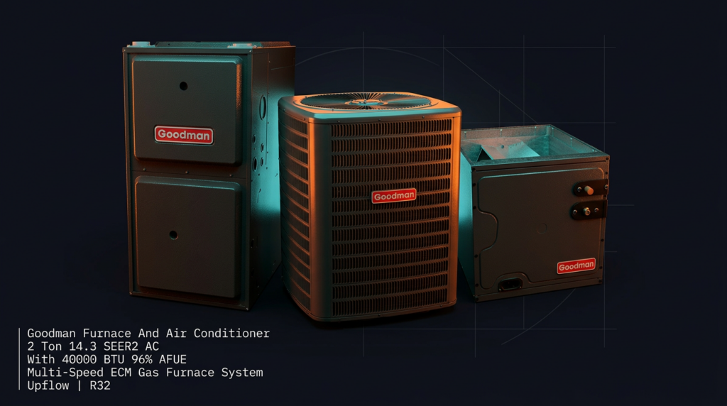 The Goodman 2 Ton 14.3 SEER2 AC with 40000 BTU 96% AFUE furnace system delivers efficient heating and cooling for residential applications in upflow configurations. This R32-based split system combines a high-efficiency air conditioner with a multi-speed ECM gas furnace, making it suitable for homeowners seeking energy-efficient operation and lower utility costs.