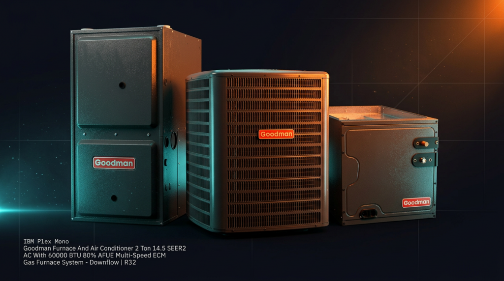 The Goodman 2 Ton 14.5 SEER2 AC with 60000 BTU 80% AFUE Gas Furnace is a complete split-system solution combining high-efficiency cooling and reliable heating in downflow configuration. This R32 refrigerant system is designed for homeowners and contractors seeking dependable performance with solid efficiency ratings at a competitive price point. The multi-speed ECM blower motor delivers flexible operation across both heating and cooling cycles.