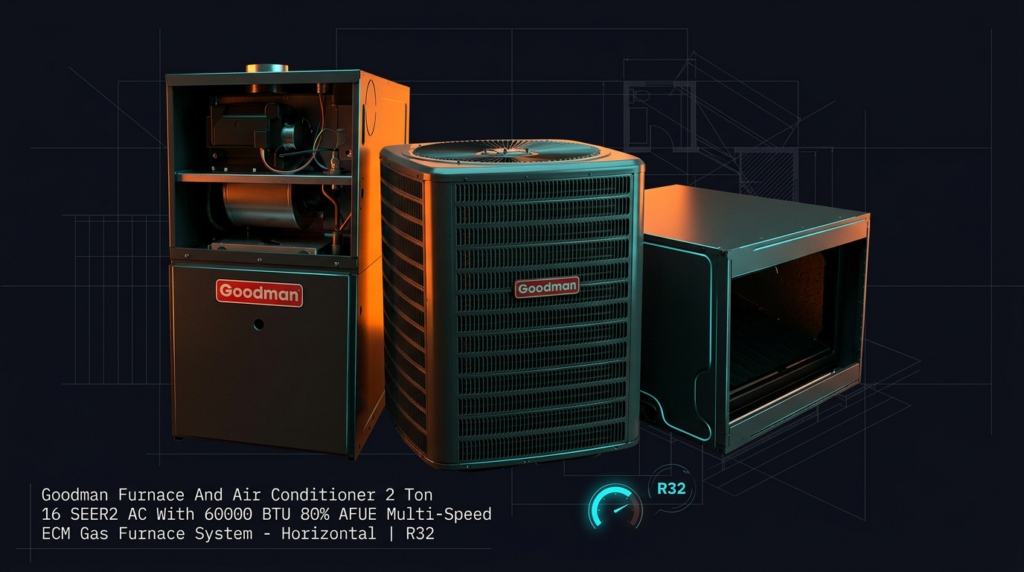 The Goodman 2 Ton 16 SEER2 system combines a high-efficiency R32 air conditioner with an 80% AFUE gas furnace for year-round climate control. This horizontal split system is designed for homeowners and contractors seeking reliable cooling and heating performance with factory-charged refrigerant and multi-speed ECM blower capability.