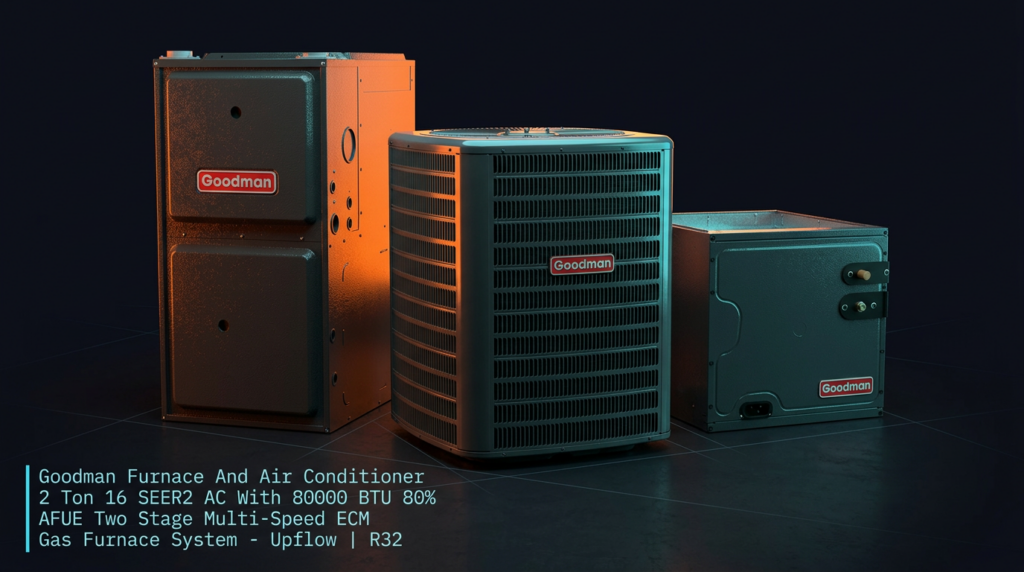Goodman Furnace And Air Conditioner 2 Ton 16 SEER2 AC With 80000 BTU 80% AFUE Two Stage Multi-Speed ECM Gas Furnace System – Upflow | R32