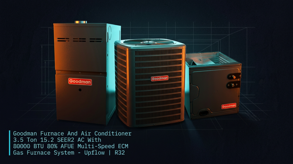 The Goodman 3.5 Ton 15.2 SEER2 R32 AC with 80,000 BTU 80% AFUE Gas Furnace is a complete heating and cooling system designed for upflow installations. This matched system combines a high-efficiency scroll compressor condenser with a multi-speed ECM furnace to deliver reliable performance for residential applications. It’s ideal for homeowners seeking an efficient, factory-charged system ready for installation with minimal additional equipment.