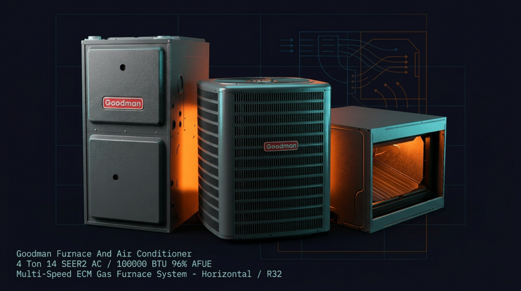 Goodman Furnace And Air Conditioner 4 Ton 14 SEER2 AC With 100000 BTU 96% AFUE Multi-Speed ECM Gas Furnace System – Horizontal | R32