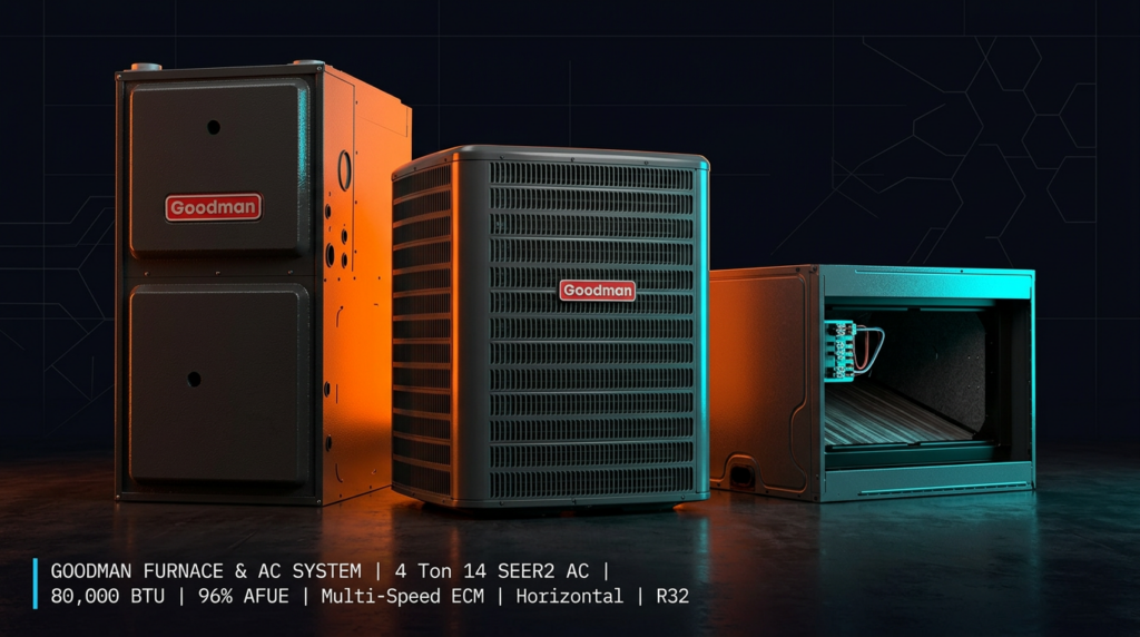 Goodman Furnace And Air Conditioner 4 Ton 14 SEER2 AC With 80000 BTU 96% AFUE Multi-Speed ECM Gas Furnace System – Horizontal | R32