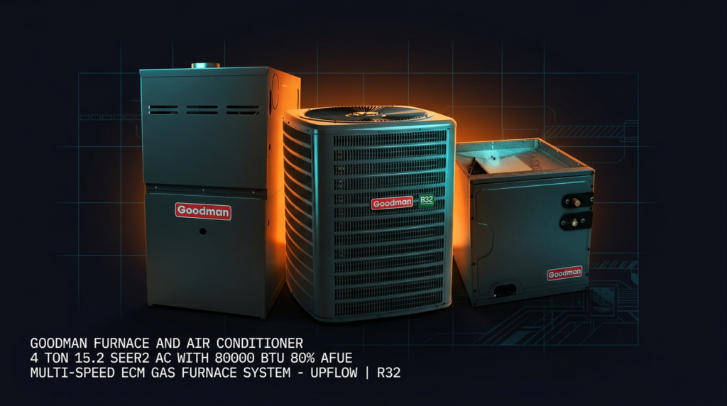 The Goodman 4 Ton 15.2 SEER2 system pairs a high-efficiency scroll compressor condenser with an 80% AFUE multi-speed ECM gas furnace for year-round climate control. This R32 refrigerant unit delivers reliable performance for residential applications in upflow configuration and is AHRI certified for documented efficiency ratings.