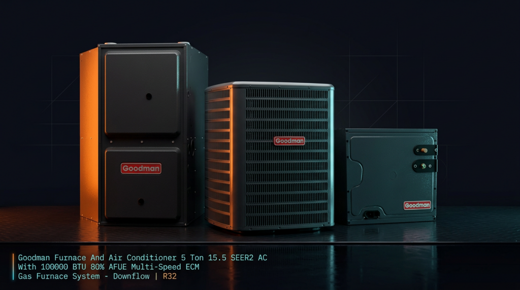 Goodman Furnace And Air Conditioner 5 Ton 15.5 SEER2 AC With 100000 BTU 80% AFUE Multi-Speed ECM Gas Furnace System – Downflow | R32