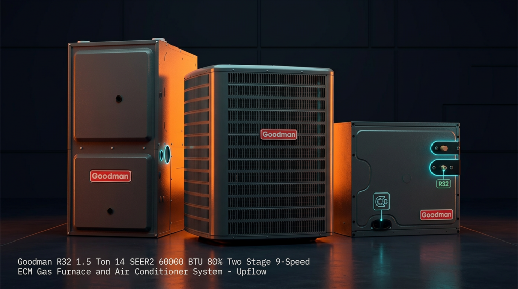 The Goodman R32 1.5 Ton 14 SEER2 Gas Furnace and Air Conditioner System delivers efficient heating and cooling in an upflow configuration. This AHRI-certified combo system pairs a high-efficiency air conditioner with an 80% two-stage gas furnace, making it suitable for homeowners seeking reliable performance and lower energy costs. The R32 refrigerant and 9-speed ECM motor provide quiet, efficient operation year-round.