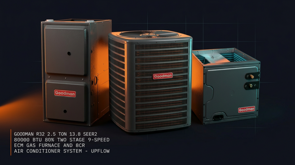 The Goodman R32 2.5 Ton 13.8 SEER2 System combines a high-efficiency air conditioner with a two-stage gas furnace for year-round comfort. This upflow configuration delivers 80,000 BTU of heating capacity at 80% efficiency with an energy-efficient R32 refrigerant compressor. It’s built for homeowners and contractors seeking reliable performance with lower operating costs.