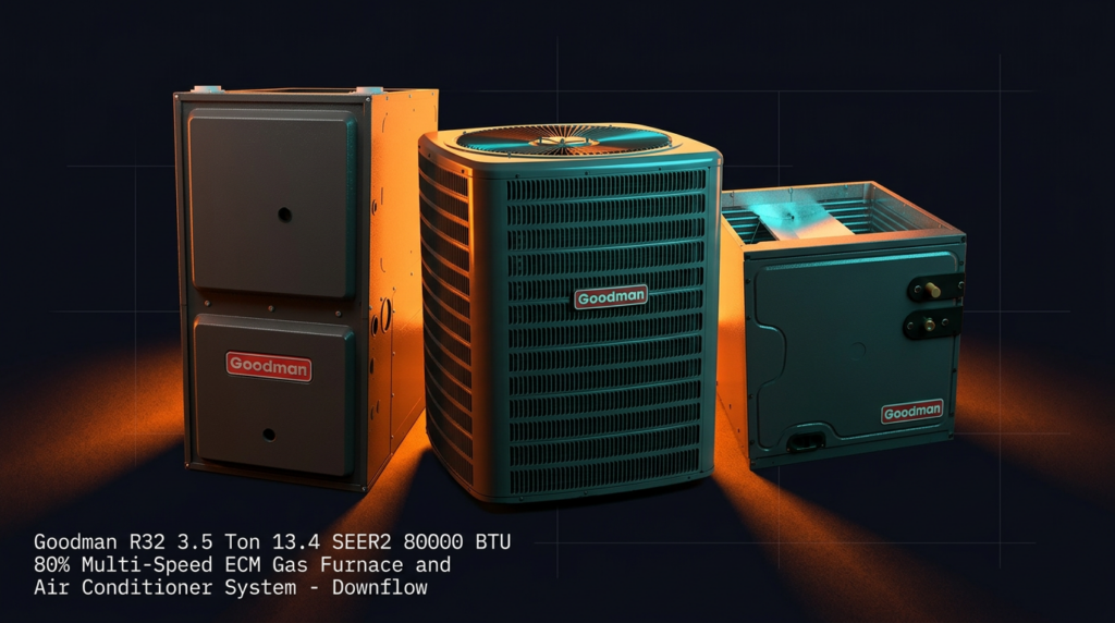 The Goodman R32 3.5 Ton 13.4 SEER2 80000 BTU 80% Multi-Speed ECM Gas Furnace and Air Conditioner System is a complete heating and cooling solution designed for downflow installations. This system pairs an efficient R32 condenser with an 80% AFUE gas furnace, delivering reliable comfort for residential applications. The multi-speed ECM blower motor and high-efficiency compressor reduce energy consumption while maintaining consistent temperature control.