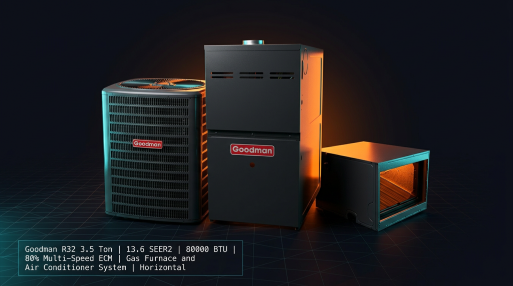 The Goodman R32 3.5 Ton 13.6 SEER2 horizontal system combines a high-efficiency air conditioner with an 80% AFUE gas furnace featuring multi-speed ECM blower technology. This package delivers year-round comfort with reduced energy consumption, making it suitable for homeowners seeking reliable heating and cooling without premium pricing. The R32 refrigerant and factory charge for 15 feet of tubing simplify installation and ensure consistent performance.