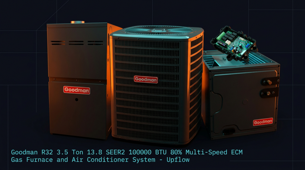 The Goodman R32 3.5 Ton 13.8 SEER2 Gas Furnace and Air Conditioner System delivers efficient heating and cooling in an upflow configuration. This complete system combines an energy-efficient air conditioner with an 80% efficiency gas furnace rated for 100,000 BTU output. It’s designed for homeowners seeking reliable climate control with solid efficiency ratings and straightforward installation.