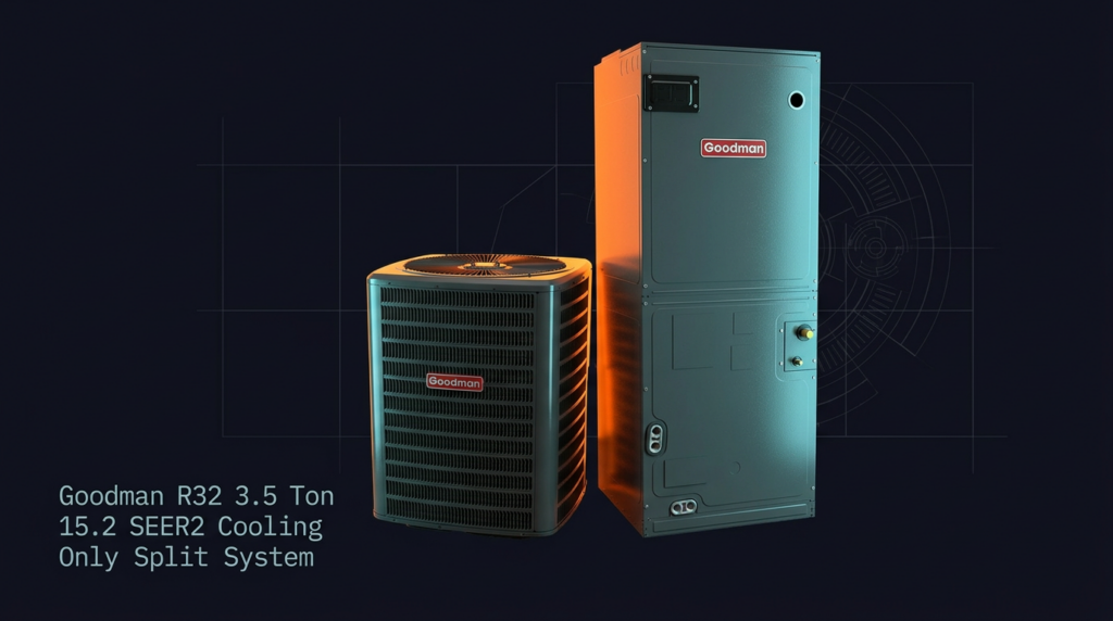 The Goodman R32 3.5 Ton 15.2 SEER2 Cooling Only Split System is a high-efficiency air conditioning unit designed for homeowners and contractors seeking reliable cooling performance with modern R-32 refrigerant technology. This system pairs the GLXS5B condenser with the AMST48CU1300 air handler to deliver dependable cooling with low refrigerant charge requirements. The AHRI-certified setup offers an excellent balance of efficiency and affordability for retrofit and new construction applications.