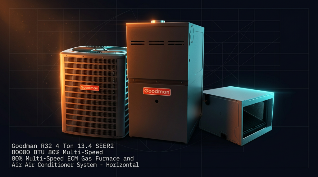 The Goodman R32 4 Ton 13.4 SEER2 horizontal system combines a high-efficiency air conditioner with an 80% AFUE gas furnace for year-round climate control. This package is ideal for residential applications requiring both cooling and heating in a compact horizontal configuration. The R32 refrigerant and multi-speed ECM motor deliver efficient operation while maintaining reliable performance.