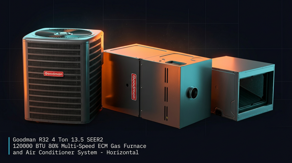 The Goodman R32 4 Ton 13.5 SEER2 system combines a 120,000 BTU 80% efficient gas furnace with a matching air conditioner condenser for complete heating and cooling. This horizontal configuration is designed for homeowners and contractors seeking reliable equipment with solid efficiency ratings and R32 refrigerant technology.