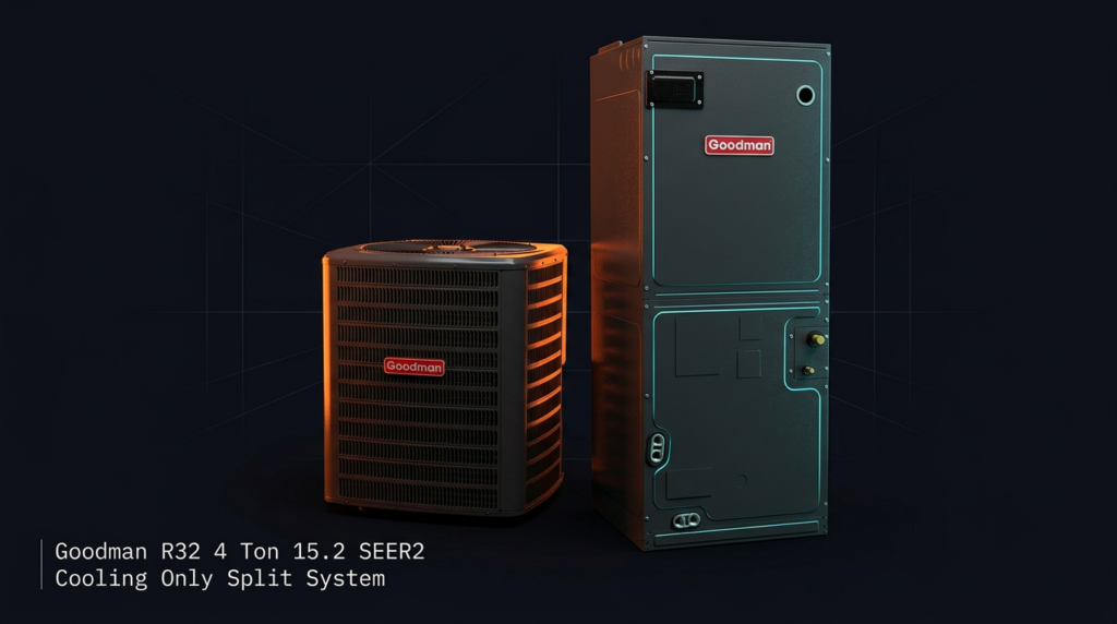 The Goodman R32 4 Ton 15.2 SEER2 Cooling Only Split System delivers efficient air conditioning performance using environmentally-friendly R32 refrigerant. This system pairs the GLXS5B condenser with the AMST48CU1300 air handler and is designed for contractors and homeowners seeking high-efficiency cooling without heat pump functionality. The setup comes fully charged for 15 feet of tubing, reducing installation complexity and on-site preparation time.