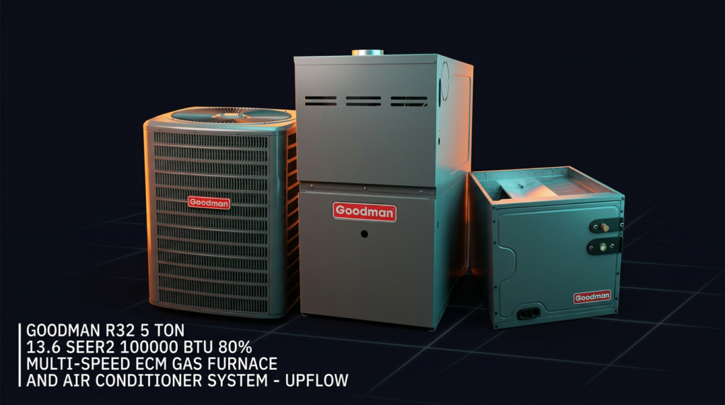 The Goodman R32 5 Ton 13.6 SEER2 Gas Furnace and Air Conditioner System is a complete heating and cooling solution designed for upflow installations in residential applications. This system pairs an energy-efficient air conditioner condenser with an 80% multi-speed ECM gas furnace to deliver reliable performance and lower operating costs. The R32 refrigerant and high-efficiency components make this setup ideal for homeowners seeking AHRI-certified equipment with extended warranties.