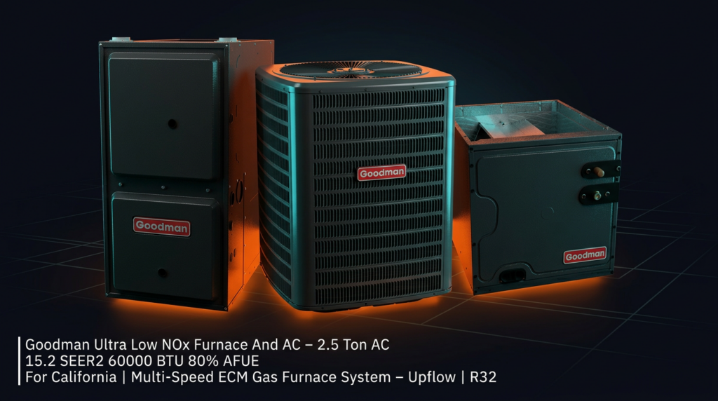 The Goodman Ultra Low NOx 2.5 Ton system combines a 15.2 SEER2 R32 air conditioner with a high-efficiency 80% AFUE gas furnace, delivering year-round comfort while meeting California’s strict air quality standards. This multi-speed ECM furnace system is engineered for upflow installation and designed for homeowners and contractors seeking reliable performance with lower operating costs and reduced emissions.