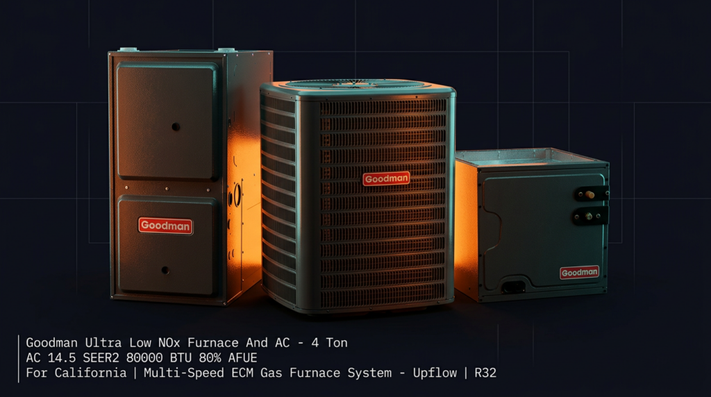 Goodman Ultra Low NOx Furnace And AC – 4 Ton AC 14.5 SEER2 80000 BTU 80% AFUE For California | Multi-Speed ECM Gas Furnace System – Upflow | R32