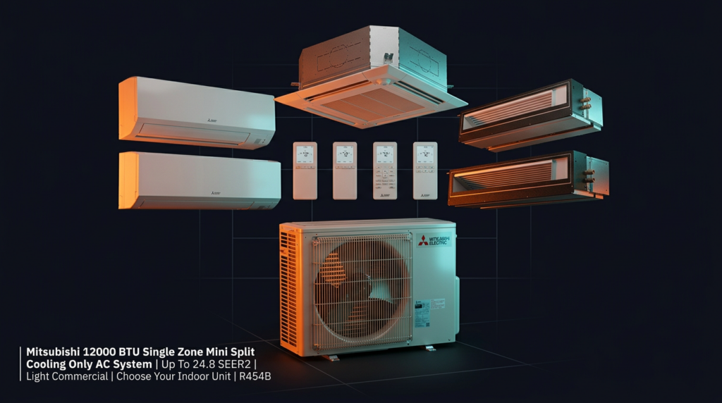 The Mitsubishi 12000 BTU Single Zone Mini Split Cooling Only AC System delivers efficient cooling for light commercial spaces up to 24.8 SEER2. This system pairs the durable PUY-AK12NL outdoor unit with your choice of indoor unit, including ducted options like the PEAD-AA12NL for multi-room coverage. Built with R454B refrigerant and inverter-driven compressor technology, it maintains precise temperature control while reducing energy consumption.