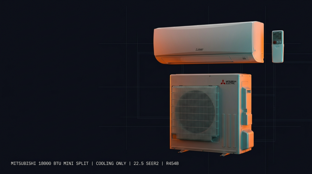 The Mitsubishi 18000 BTU Mini Split Cooling Only AC Wall Mount System delivers efficient single-zone cooling for residential and light commercial spaces. This wall-mounted unit operates at 22.5 SEER2 efficiency using R454B refrigerant and is ideal for homeowners and contractors seeking reliable, quiet cooling with minimal maintenance requirements.