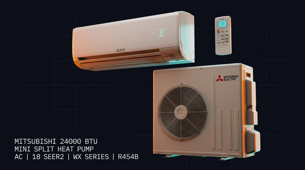 The Mitsubishi 24000 BTU Mini Split Heat Pump AC Wall Mount System delivers efficient heating and cooling for single-zone residential and light commercial spaces up to 22,400 BTU/H. This ductless system combines the quiet MSZ-WX24NL indoor wall unit with the MUZ-WX24NL outdoor condenser to provide energy-efficient climate control without ducting requirements. With an 18 SEER2 rating and inverter-driven compressor technology, this WX Series system reduces energy consumption while maintaining consistent comfort.