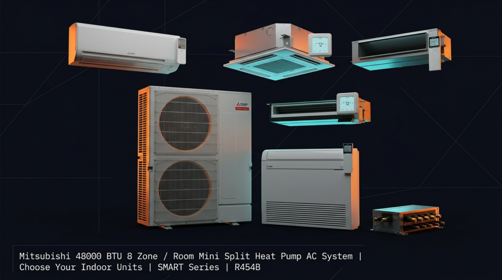 Mitsubishi 48000 BTU 8 Zone / Room Mini Split Heat Pump AC System | Choose Your Indoor Units | SMART Series | R454B
