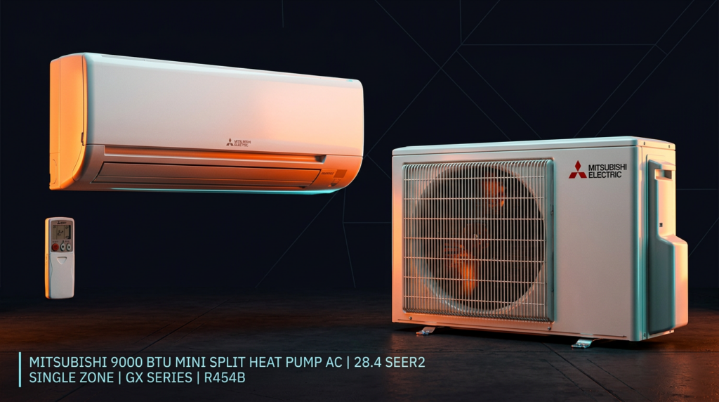 The Mitsubishi 9000 BTU Mini Split Heat Pump AC Wall Mount Indoor Unit System delivers efficient single-zone climate control with a 28.4 SEER2 rating. This GX Series system is ideal for homeowners and contractors seeking reliable heating and cooling in a compact, wall-mounted design. The R454B refrigerant and inverter-driven compressor provide precise capacity delivery for lower energy consumption and faster temperature response.