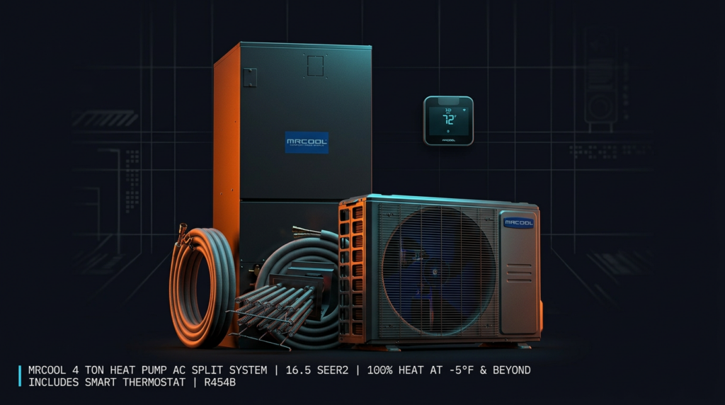 The MrCool 4 Ton Heat Pump AC Split System delivers year-round comfort with 16.5 SEER2 efficiency and exceptional cold-climate heating that maintains 100% output at -5°F and beyond. This complete system includes the CENTRAL-48-HP-C-230B00-O condenser, MVP-48-HP-MUAH-230A00-O air handler, R454B lineset, and MST04 smart thermostat. It’s built for homeowners in cold climates who need reliable heating without supplemental electric resistance.