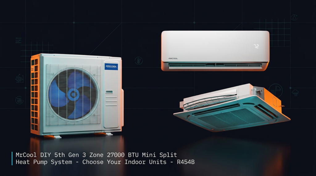 The MrCool DIY 5th Gen 27,000 BTU 3-Zone Mini Split Heat Pump System delivers heating and cooling to up to three rooms with pre-charged line sets and Quick Connect fittings that eliminate the need for a vacuum pump. This system is ideal for homeowners and small commercial spaces seeking efficient climate control without professional installation costs. The inverter compressor technology provides consistent comfort while maintaining energy efficiency.