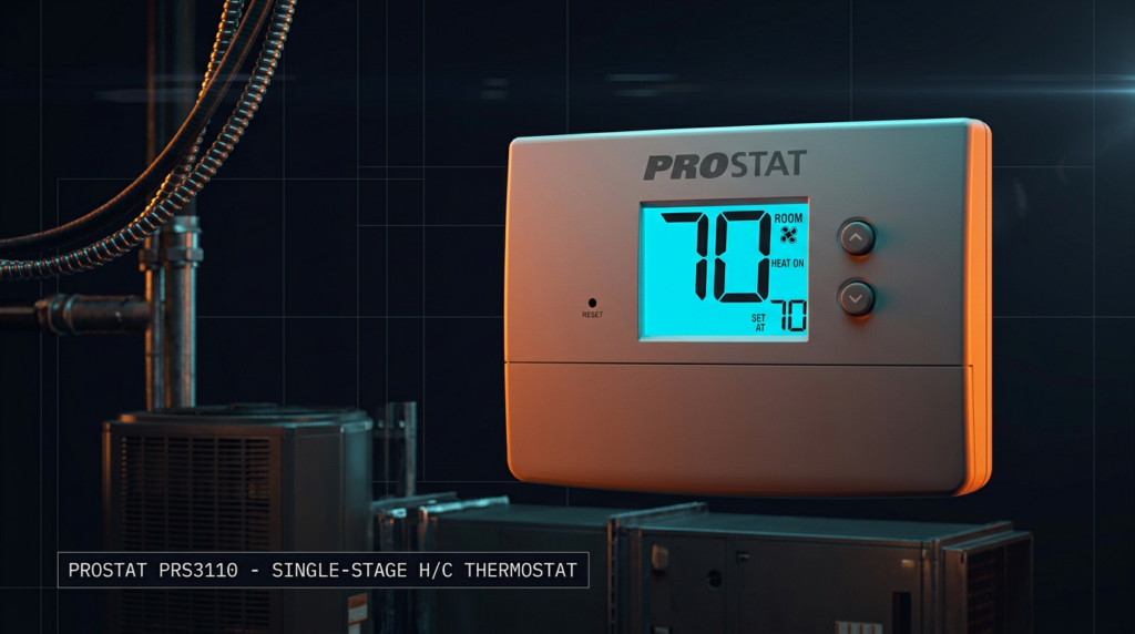 The ProStat PRS3110 is a single-stage heating and cooling thermostat designed for straightforward temperature control in residential and light commercial applications. This non-programmable model is ideal for users who prefer manual operation without scheduling complexity. The PRS3110 delivers reliable performance at an affordable price point for basic comfort management.