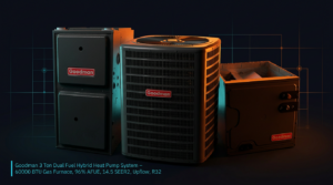Goodman 3 Ton Dual Fuel Hybrid Heat Pump System – 80000 BTU Gas Furnace, 96% AFUE, 14.5 SEER2, Upflow, R32